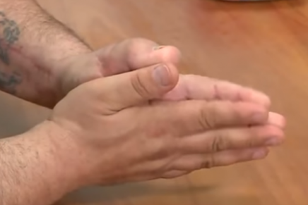 Melo Hairapetian de 45 años sufrió un fatal accidente con una filosa sierra eléctrica, comprometiendo su pulgar y meñique de la misma mano, que apenas colgaba de una tira de tejido.
