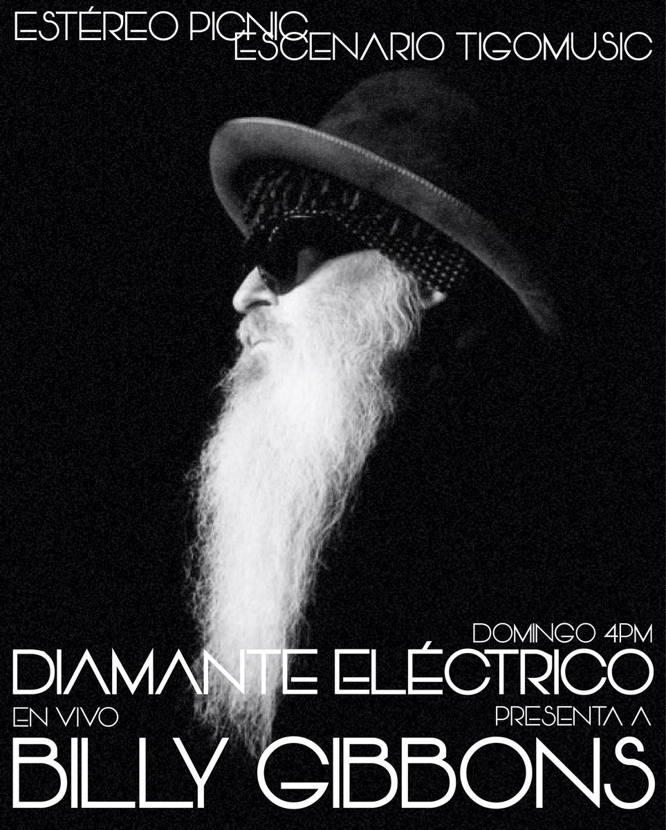 La banda colombiana de rock, liderada por Juan Galeano, Diamante Eléctrico, anunció que tocará junto al legendario guitarrista estadounidense de blues rock, rock sureño y boogie rock, miembro del grupo ZZ Top, Billy F. Gibbons, el próximo domingo 25 de enero en el Festival Estéreo Picnic.