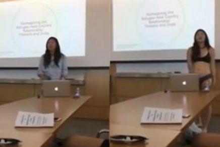 La estudiante universitaria de Ithaca, Nueva York, defendió a capa y espada su tesis de grado, tanto así que no le importo “salirse de la ropa” para que sus compañeros y el jurado no perdieran su atención en otras cosas.