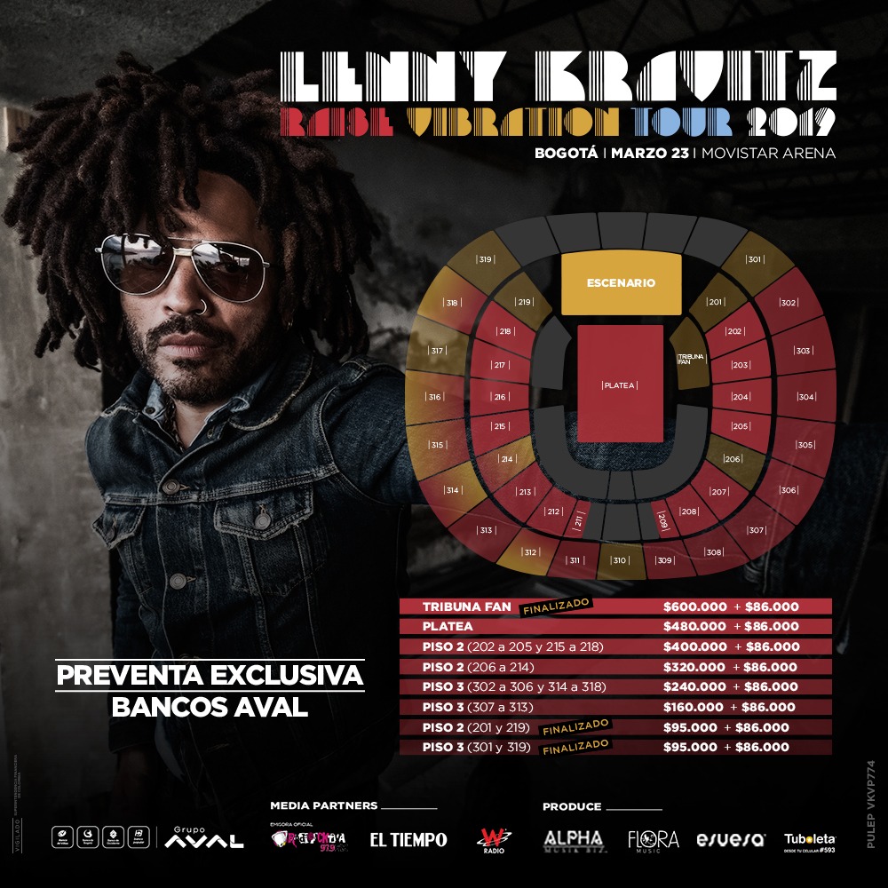 La preventa de entradas para ver a Lenny Kravitz en Colombia se habilitará para clientes de los Bancos Aval el 27 de noviembre a las 9:00 a.m y estará disponible hasta el 29 de noviembre o hasta agotar existencias. Esta preventa estará dirigida para los tarjetahabientes de Grupo Aval y aplica para compras con tarjetas Crédito y Débito de los Bancos AV Villas, Bogotá, Occidente y Popular, pagos en puntos de venta y página web de TuBoleta. Aplica para máximo 4 boletas por transacción.