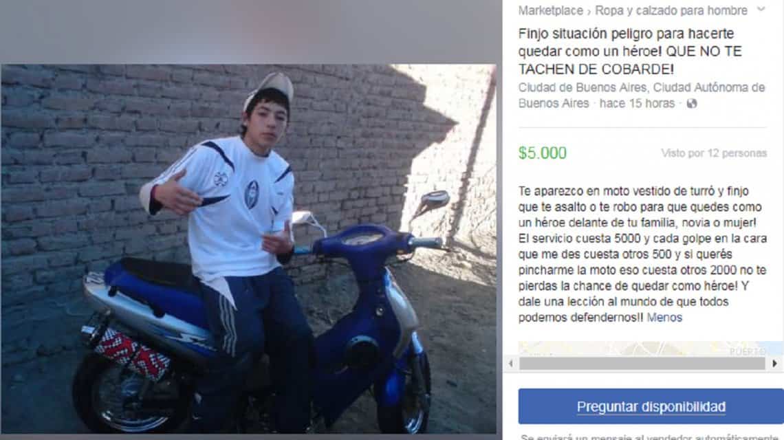 “Te aparezco en moto vestido de turro (ladrón) y finjo que te asalto o te robo para que quedes como un héroe delante de tu familia, novia o mujer! El servicio cuesta 5000 y cada golpe en la cara que me des cuesta otros 500 y si querés pincharme la moto eso cuesta otros 2000 no te pierdas la chance de quedar como héroe! Y dale una lección al mundo de que todos podemos defendernos!!“, escribió el hombre en el anuncio.