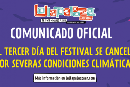 Debido a las severas condiciones climáticas ocurridas durante la noche, con fuertes tormentas, relámpagos y ráfagas de viento que se espera continúen durante todo el día, se ha resuelto, en cumplimiento con instrucciones de autoridades gubernamentales, cancelar la tercera fecha del festival. Quienes hayan adquirido entradas en el sitio oficial pueden visitar la aplicación de Lollapalooza Argentina, www.lollapaloozaar.com y sus redes sociales para obtener información sobre el reembolso correspondiente a la tercera fecha. “Siendo nuestra prioridad absoluta la seguridad de nuestro público, artistas y staff –como sucedió los pasados viernes y sábado- y tal como nos indicaron las autoridades gubernamentales, en sintonía con nuestra política de respeto y cuidado de nuestra gente, nos vemos obligados a tener que tomar la lamentable decisión de cancelar la tercera jornada del festival”, dijo Diego Finkelstein, fundador de DF Entertainment, el promotor de Lollapalooza Argentina. ¡Muchas gracias por la difusión!
