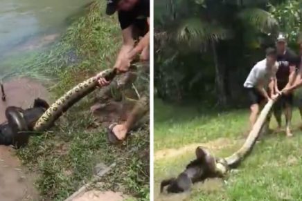 De manera inmediata, la familia empezó a buscar a su amigo canino y se da cuenta que este estaba siendo asfixiado por una anaconda en un estanque y, al notar lo que estaba pasando, tres hombres salen desesperadamente en rescate del perro.