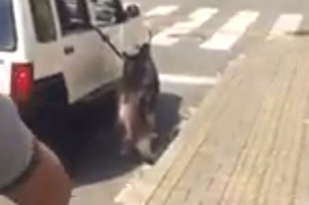 La página de Facebook Análisis Urbano publicó el video donde muestra a un perro raza Husky Siberiano amarrado a una puerta de un carro mientras estaba a la espera del cambio de semáforo. El denunciante: