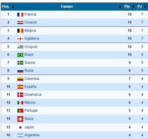 Francia, la campeona del Mundial, obtuvo 19 puntos de 21 posibles y Bélgica fue el segundo equipo que más puntos logró con 18, pero no le alcanzó para llegar a la final.