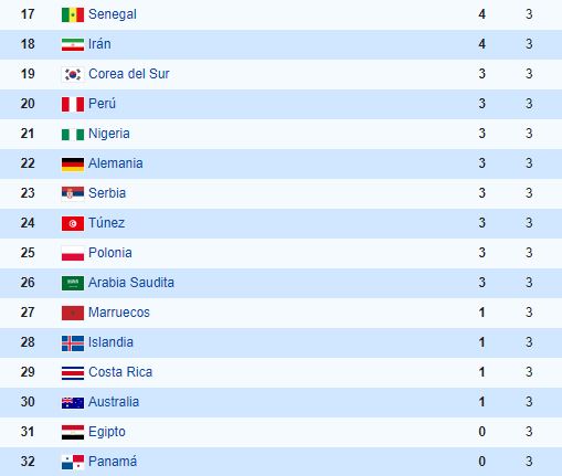 Los únicos equipos que no sumaron ni un solo punto en el Mundial fueron Egipto y Panamá.