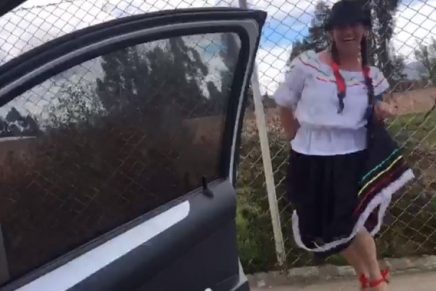 En video, se ve a la mujer vestida de campesina, bailar junto al carro una canción popular de Colombia.
