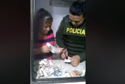 En la página de Facebook de ‘Análisis urbano’ se publicó el video donde aparece la mujer en la estación de policía de Filandia, Quindío, junto a un agente de la policía que de paso le ayuda a contar el dinero.