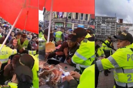 Durante un operativo de recuperación del espacio público en la Plaza de la Mariposa, en San Victorino, un grupo de uniformados golpeó y agredió verbalmente a unas mujeres que intervinieron en el momento en el que un vendedor de chicharrones estaba siendo arrastrado, así lo dejó evidenciado un video que está circulando en las redes sociales.