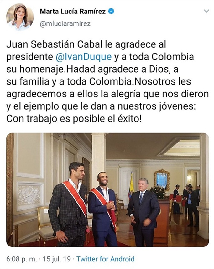 .@juanscabal le agradece al presidente @IvanDuque y a toda Colombia su homenaje. @RobertFarah_ agradece a Dios, a su familia y a toda Colombia. Nosotros les agradecemos a ellos la alegría que nos dieron y el ejemplo que le dan a nuestros jóvenes: Con trabajo es posible el éxito! pic.twitter.com/laMgKv416y
