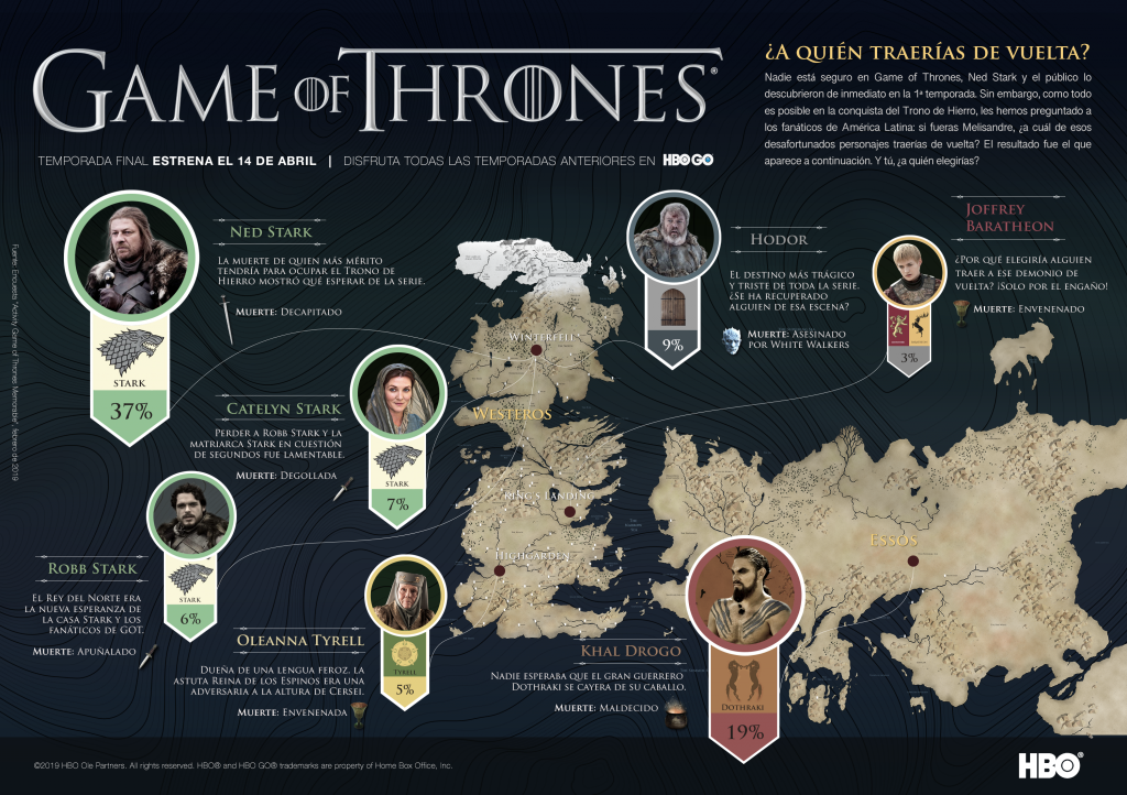 Nadie está seguro en Game of Thrones, Ned Stark y el público lo descubrieron de inmediato en la 1ª temporada. Sin embargo, como todo es posible en la conquista del Trono de Hierro, HBO le preguntó a los fanáticos de América Latina: si fueras Melisandre, ¿a cuál de esos desafortunados personajes traerías de vuelta?
