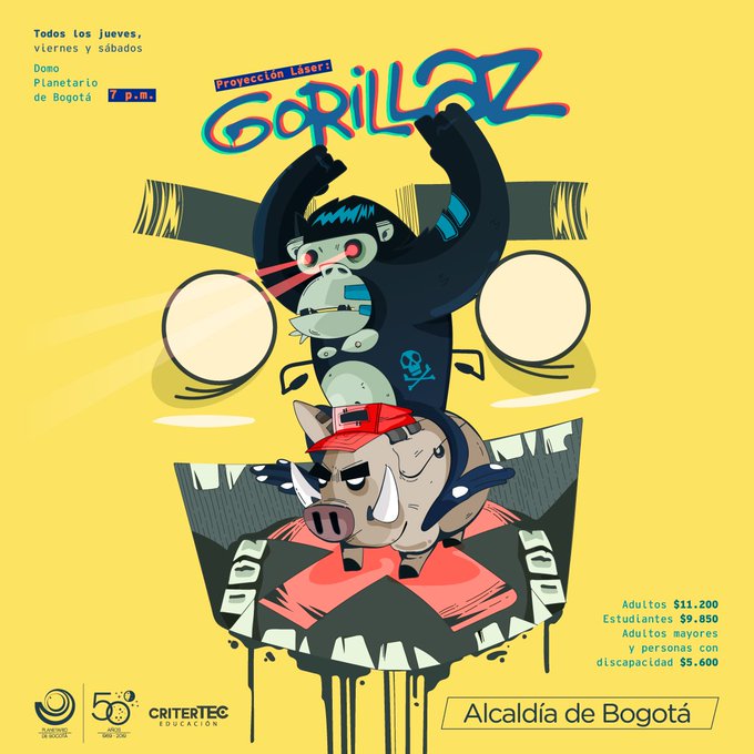 La música de la banda británica liderada por Damon Albarn, llega este noviembre al Planetario de Bogotá con un increíble show láser que incluirá éxitos como Clint Eastwood, Stylo, Dirty Harry y On Melancholy Hill.