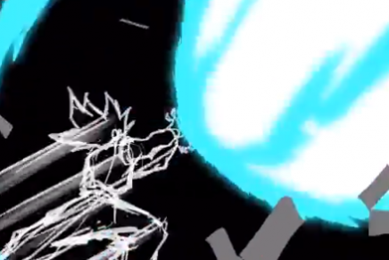 El fragmento muestra al personaje con el conocido movimiento con el que alista la técnica, juntando sus manos acumulando la energía y expulsándola hacía adelante.