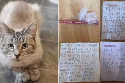 “Por favor, mantengan a su gato dentro de su hogar. El gato viene casi a diario a mi casa, se lleva comida de la mesa, rasguña mi sofá, esparce pulgas por la vivienda. No puedo dejar las ventanas abiertas. Sinceramente estoy harto. Si vuelvo a ver a su gato nuevamente en mi casa, prometo que lo llevaré lejos a alguna parte. Su gato también se queda por las noches y duerme en la cocina. Mejor aliméntenlo”.