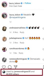 Pero algo que llamó mucho la atención fue uno de los ‘Me gusta’ que recibió Laura Tobón, pues hasta el reconocido futbolista James Rodríguez no pudo ocultar su reacción ante la sensual fotografía de la presentadora en ropa interior.