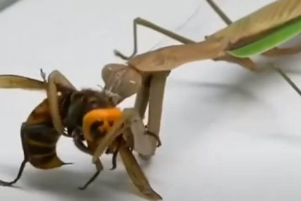 Recientemente, se volvió viral un impactante video en el que se ve a una mantis religiosa agarrar a una ‘avispa asesina’ y comérsela por la cabeza, mientras sigue viva.