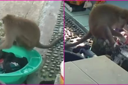 Según se puede ver en la grabación que se volvió viral en las redes sociales, el tierno mono aprovechó que la mujer no estaba y se sentó a un lado del recipiente para comenzar a estregar las prendas de ropa una y otra vez.