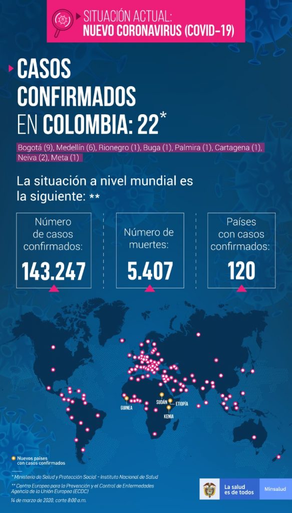 El Instituto Nacional de Salud reveló un nuevo reporte en el que se confirma 6 nuevos casos de coronavirus en el país: Bogotá (3), Rionegro (1) y Medellín (2):