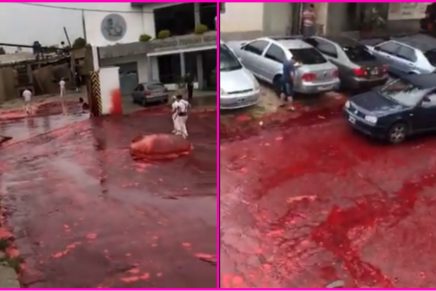 Un barrio de la ciudad de Morón, en la provincia argentina de Buenos Aires fue inundado de unos 500.000 litros de sangre animal tras reventarse un tanque de un matadero. Los vecinos escucharon una explosión y luego vieron la sangre correr por las calles. pic.twitter.com/mfugFUSSpl