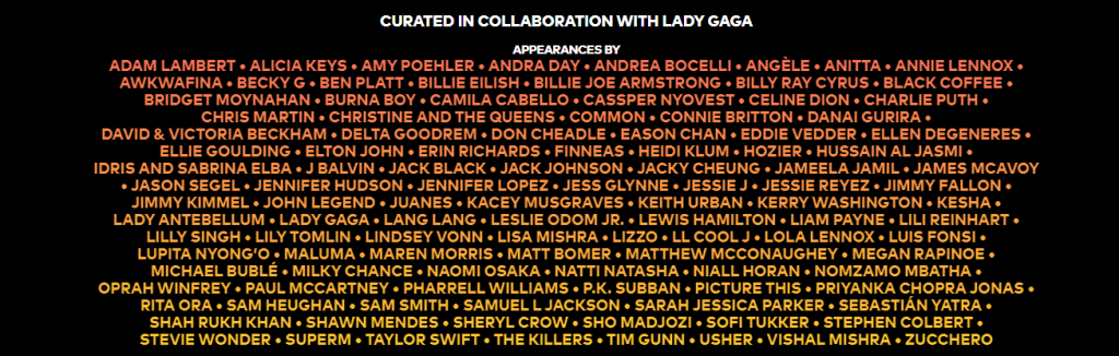 El 18 de abril, se honrará la lucha internacional contra COVID-19 en One World: Together At Home, una transmisión internacional con Global Citizen y la Organización Mundial de la Salud (OMS) para impulsar acciones para abordar a la pandemia, la cual será transmitida en todo el mundo.