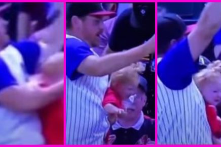 Mientras que cargaba a su hija con el brazo izquierdo, la soltó por milésimas de segundos para poder atrapar la pelota de béisbol, dándole prioridad al vaso de cerveza que cargaba en su mano derecha.