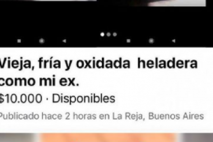 Después llegó la venta de la nevera: “Vieja, fría y oxidada heladera, como mi ex”, se lee en parte de la descripción: “Estuvo siempre vacía, el caradura no colaboraba ni con los hielitos. Si se trata de frío está de 1000 puntos. Estando a su lado no vas a saber lo que es el calor. Al lado de mi ex digo. Le funciona de 10 el motor (no como a él). Cuadrada pesada y antigua (como él). Escucho ofertas razonables por la heladera. A él te lo entrego gratis”.