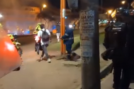 La manifestación que se llevaba a cabo en Yomasa, suroriente de la capital, donde un joven manifestante terminó siendo capturado por uniformados de Esmad, y ante su apuro por lograr librarse del lío, su papá atendió al llamado, sin embargo la reacción del señor, quien decidió reprenderlo en medio de la multitud.