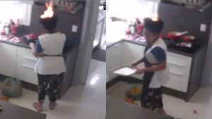 Sin duda la cocina es la pasión de más de uno, pero parece que no es para todos. Precisamente en la grabación se ve a una mujer cocinando y mientras busca algunos utencilios se le empieza a quemar el pelo, lo más divertido es que sigue como si nada, ni notó que su cabeza estaba literalmente en llamas.