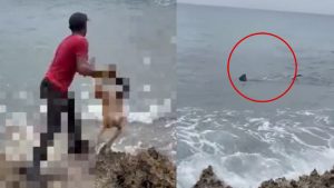 En el video que está protegiendo la fuerte escena, se alcanza a ver al perro amarrado de sus patas y posteriormente lanzado al mar, minutos después llega un tiburón muy cerca de la orilla.