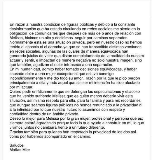 A pesar de que en el comunicado Mier pide a la opinión pública respeto y prudencia para con la familia de Melissa y la suya, el deportista habría aceptado la responsabilidad por la ruptura.