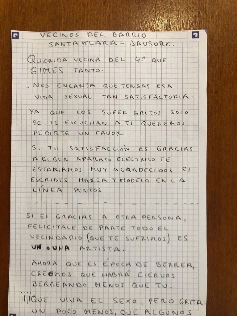 “Vecina del 4 que gime tanto, nos encanta que tengas esa vida sexual tan satisfactoria”, inicia el texto.