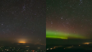 El video, que fue grabado en time-lapse (cámara rápida), publicado en el canal Best Airplane Seat de YouTube, comienza con la aparición de la galaxia de Andrómeda y el planeta Júpiter, luego sucede el espectáculo de colores, propio de una aurora boreal.