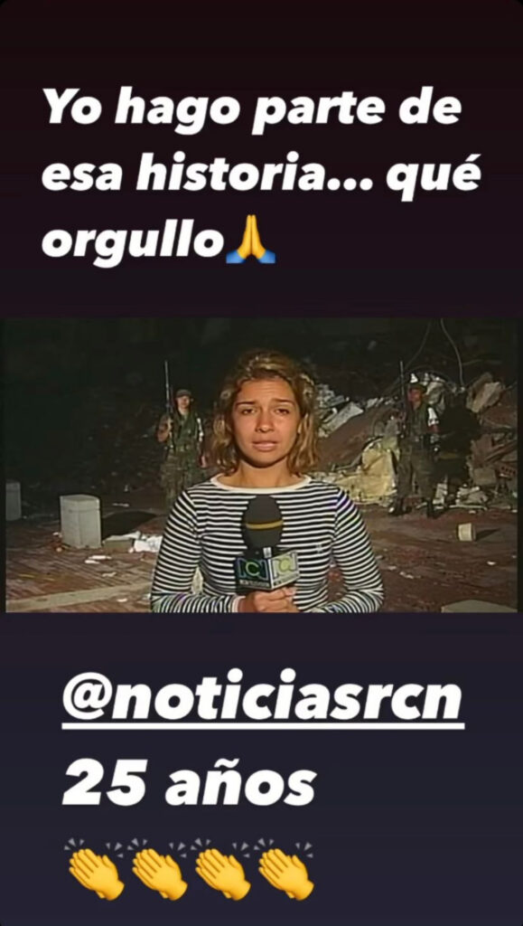 Vicky publicó la foto en su perfil de Instagram y escribió que se sentía orgullosa de ser parte de la historia de RCN. En esta se le puede ver con el cabello corto, una camiseta de rayas y detrás de ella todos los escombros por el atentado.