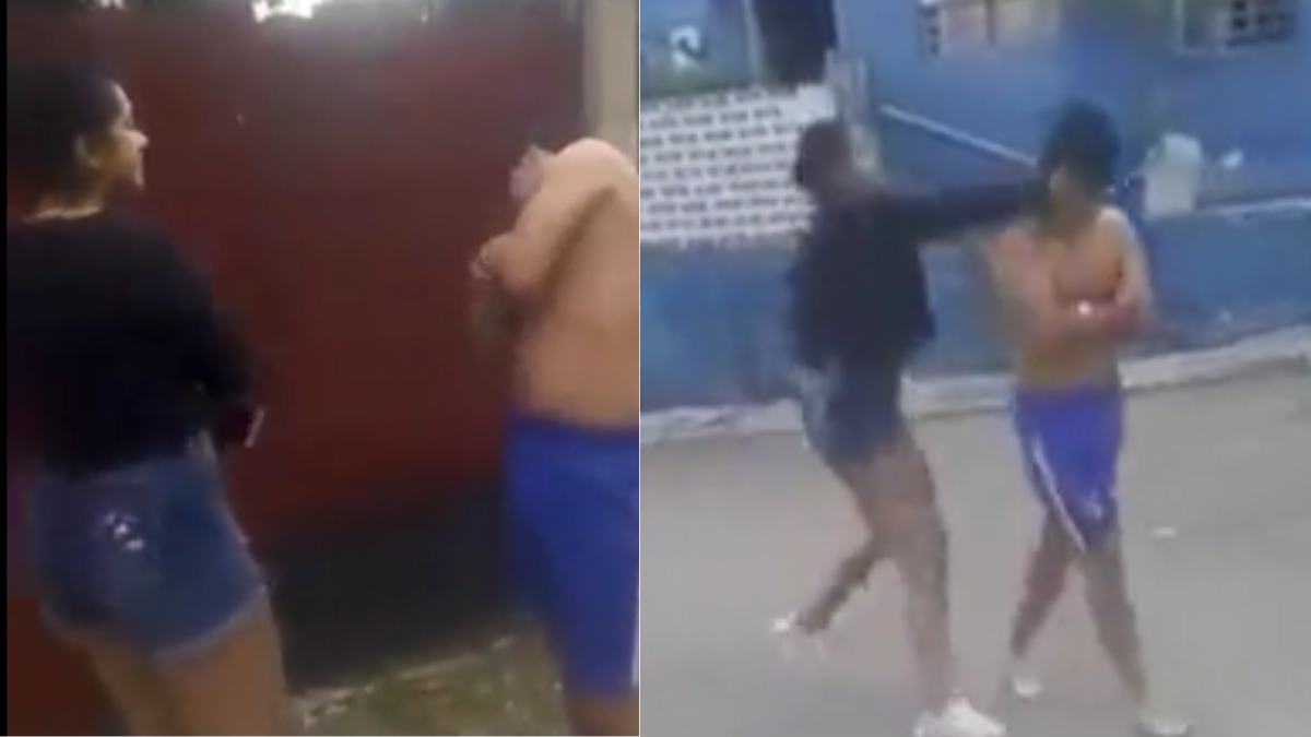 Luego la mujer le vuelve a pegar y él se corre para intentar esquivar los golpes de su novia, pero esta no se rinde y lo persigue dándole patadas y cachetas en la cara.