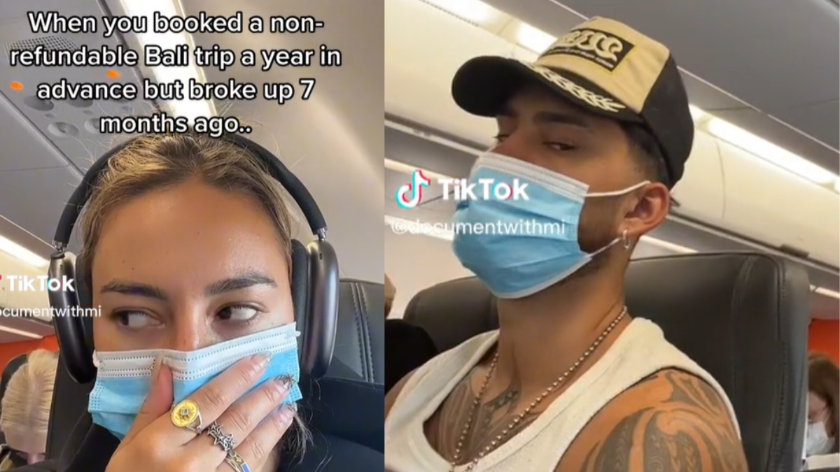 El video fue compartido por la mujer, quien subió una grabación en su cuenta de TikTok a bordo del avión junto a su expareja, la publicación la acompañó del mensaje: “Cuando tienes agendado un viaje a Bali que no es reintegrable desde hace un año y terminaste hace 7 meses”.