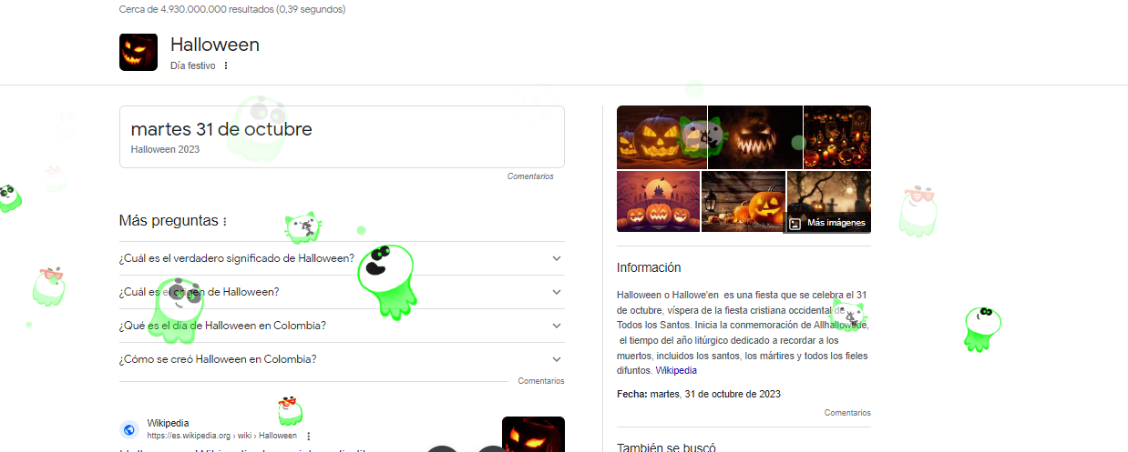 Muchas personas se dieron cuenta que si escriben en su buscador “Halloween” les aparecerán unos fantasmas verdes fosforescentes. Estos tienen formas de diferentes animales como gatos, pandas e inclusive unos con gafas.