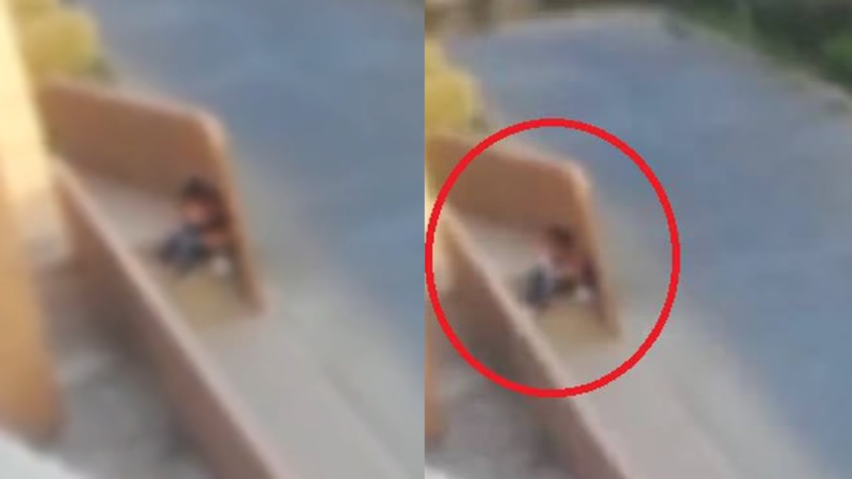 Aunque la grabación se realizó desde varios metros de distancia, se logra divisar a una persona sentada encima de otra mientras ambos se mueven de manera erótica. Además, se ve que están escondidos detrás de un muro.