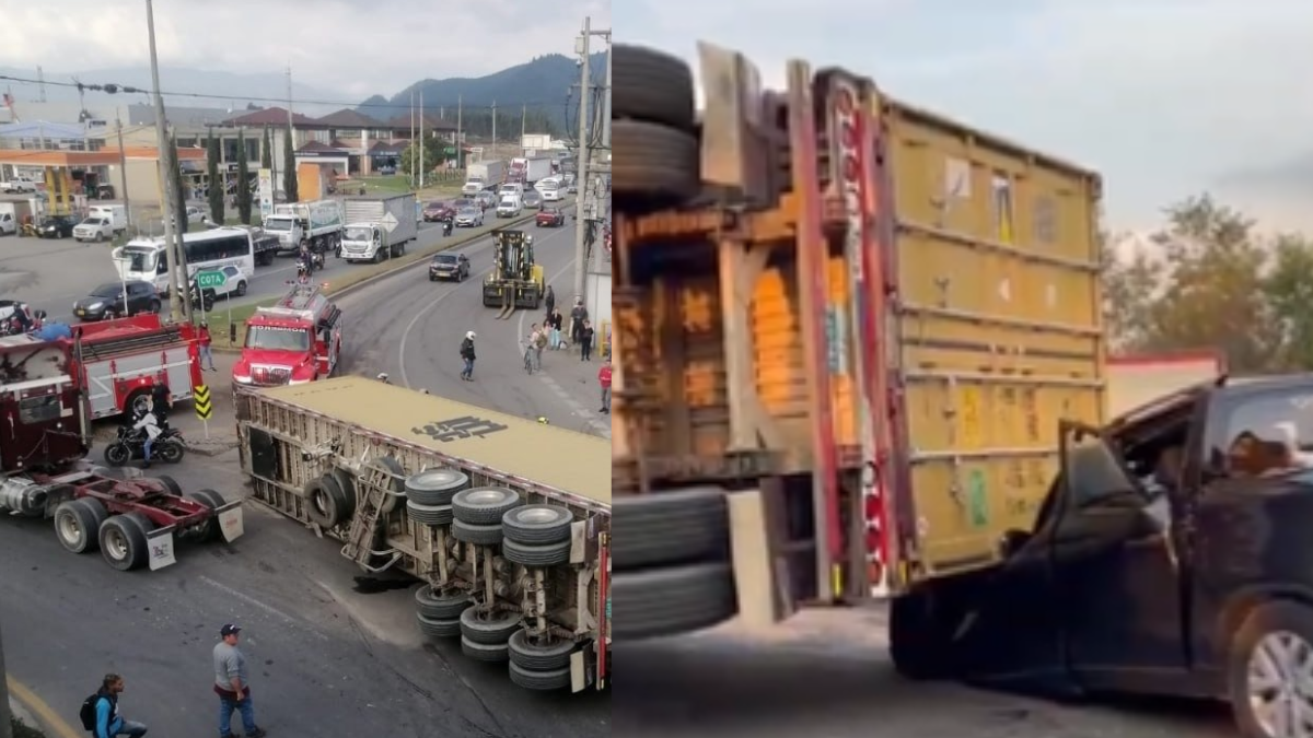 En la tarde de este lunes 18 de diciembre se presentó un aparatoso accidente en la glorieta de Siberia, Cundinamarca. Una tractomula, cargada con aproximadamente 28 toneladas de alimentos, se volcó y el container cayó sobre un vehículo particular que transitaba en la vía.