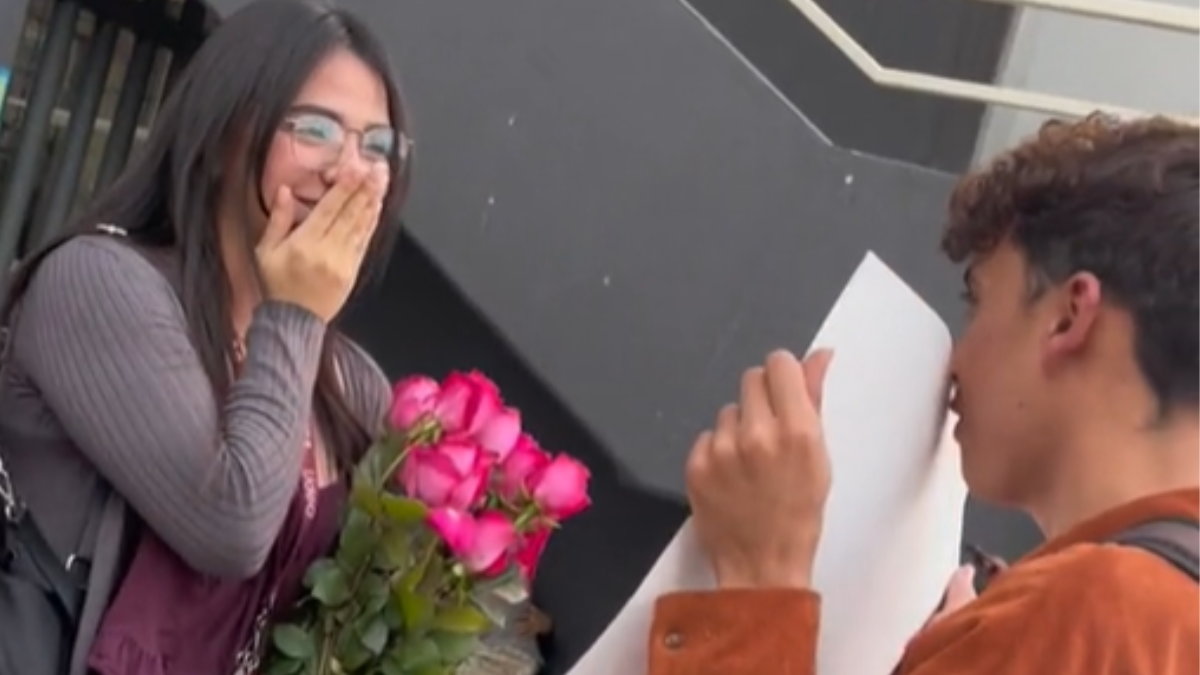 En el video, que compartió el mismo protagonista de la declaración de amor, se ve al joven llegando un ramo de flores y una cartulina en la que tenía escrita la pregunta: “¿Quieres ser mi novia?”. Esto en la mitad del patio del colegio mientras varios estudiantes estaban mirando la romántica escena.