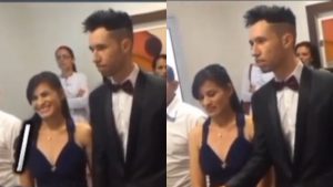 En la grabación, el notario inicia a preguntarle al novio si acepta a su pareja para unirse en matrimonio. Él responde seriamente que sí era así y el encargado procede a hacerle esta pregunta a la mujer.