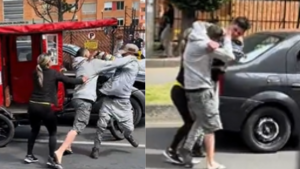 Ante el apoyo de los testigos, el bicitaxista intentó huir del lugar y fue ahí donde el conductor de la camioneta lo detuvo, lo cual terminó en una pelea física con puños y patadas en plena vía mientras los demás vehículos pasaban por el lugar.