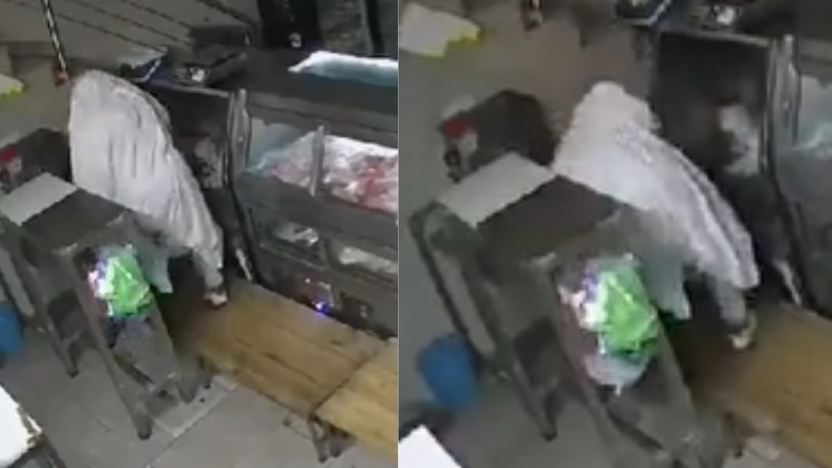 El insólito hecho quedó registrado por la cámara de seguridad del establecimiento, la cual grabó la escena en la que se ve al ladrón, cubierto con una sábana, entrando a la carnicería, al parecer, para robar lo que había en las neveras.