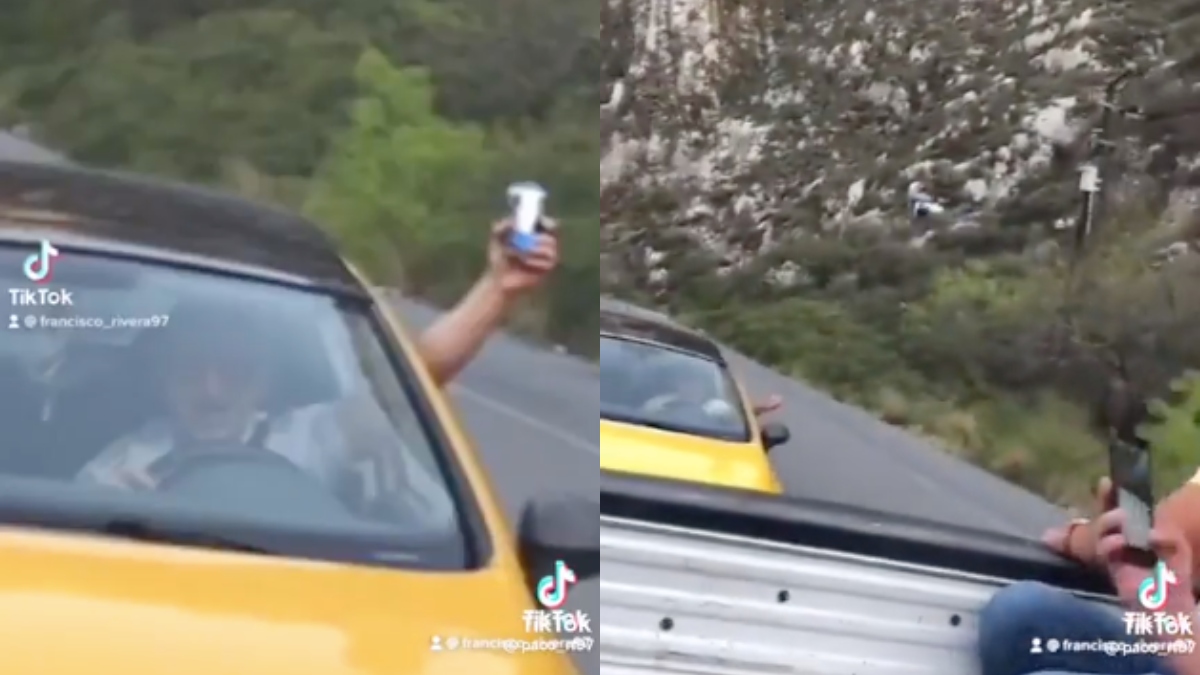 Las imágenes, que tuvieron lugar por unas de las vías de Nuevo León, México, fueron registradas por uno de los jóvenes que van en el camión, mientras el otro se acomoda para lanzar la lata al otro conductor del carro amarillo.