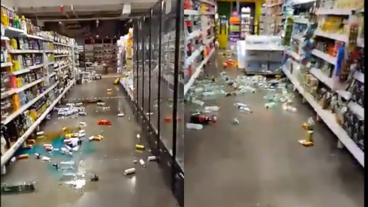 En la grabación, una persona está recorriendo los lugares en los que están ubicadas las bebidas y se ve que tanto gaseosas como botellas de vino terminaron derramadas en el piso, demostrando lo fuerte que estuvo el movimiento.