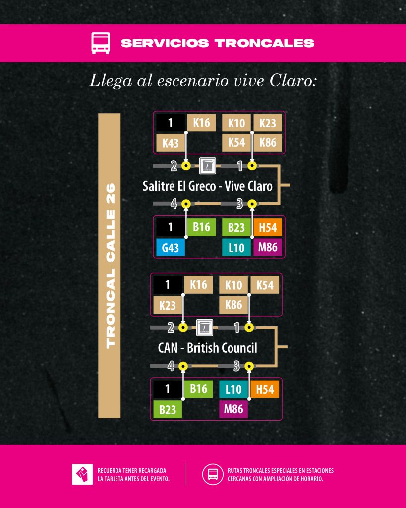 Con el fin de facilitar la llegada y salida del público, TransMilenio dispondrá de 31 rutas especiales TransMiZonal desde la Avenida Carrera 68 hacia los puntos más cercanos al recinto: estaciones Salitre – El Greco y CAN – British Council en la troncal de la Calle 26.