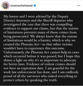 Esto significa que las acusaciones contra Manson ya eran demasiado antiguas y la evidencia presentada hasta el momento no era suficiente para acusar al cantante; igualmente el comunicado de la Fiscalía continúa diciendo.