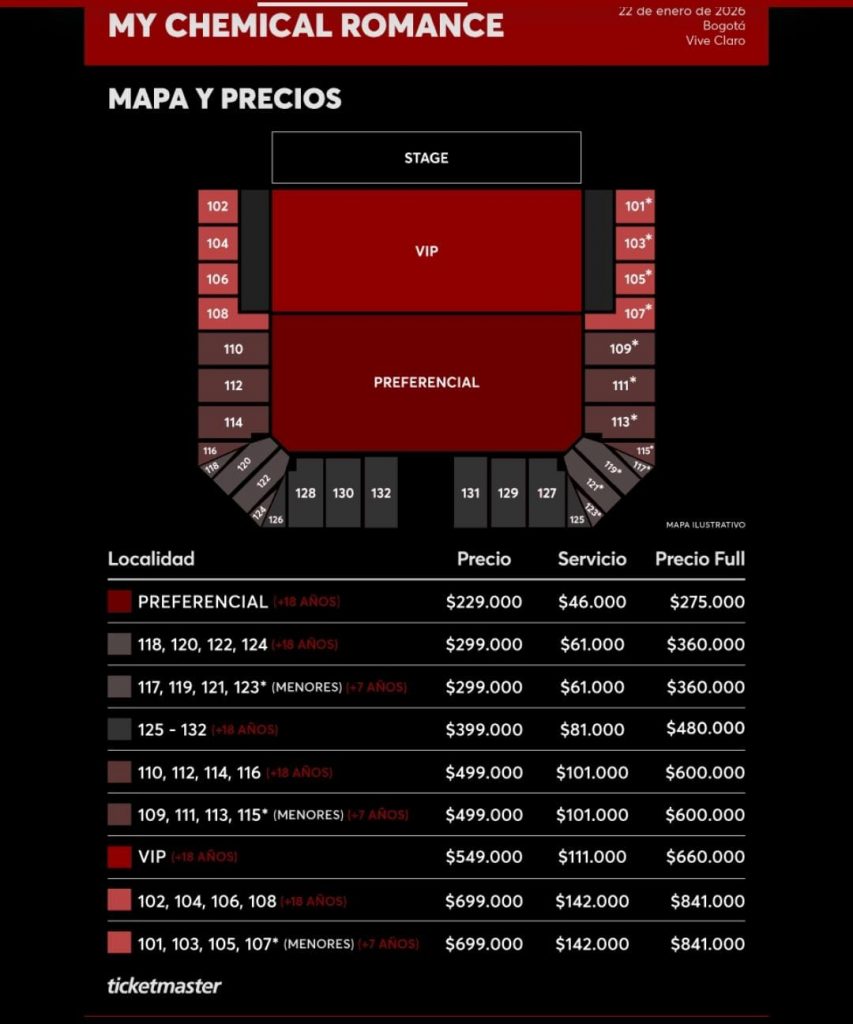 La plataforma encargada de realizar esta venta será Ticketmaster, y los precios oscilan desde los $229.00 COP + Servicio hasta los $699.000 COP + Servicio.